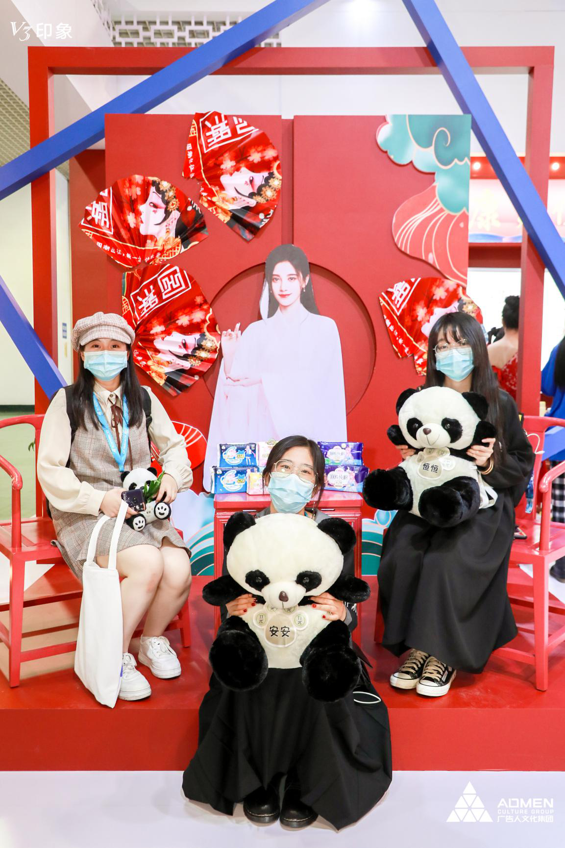 尊凯实业集团展位的正红布景极具特色,吸引了众多国风爱好者前来打卡,不少汉服小仙女都被熊猫玩偶萌翻了,纷纷合影留念。